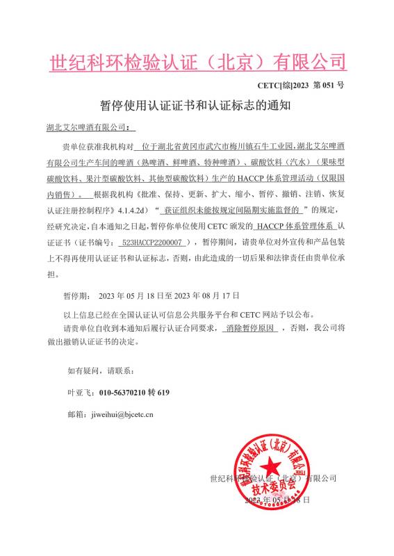 暫停使用認(rèn)證證書和認(rèn)證標(biāo)志的通知