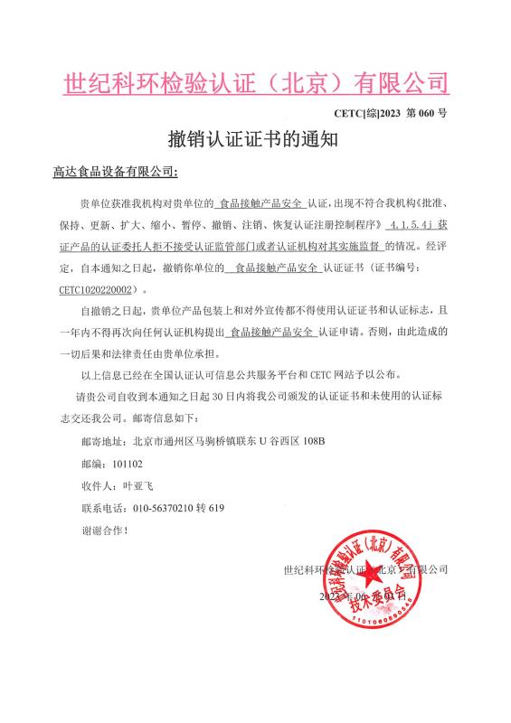 暫停使用認(rèn)證證書和認(rèn)證標(biāo)志的通知