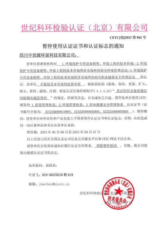 暫停使用認(rèn)證證書和認(rèn)證標(biāo)志的通知