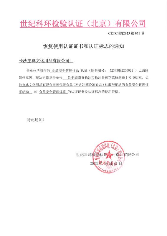恢復(fù)使用認(rèn)證證書和認(rèn)證標(biāo)志的通知