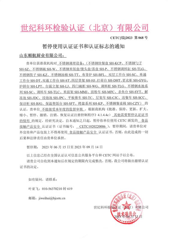 暫停使用認(rèn)證證書和認(rèn)證標(biāo)志的通知