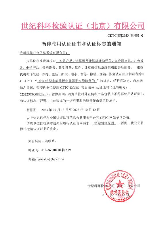 暫停使用認(rèn)證證書(shū)和認(rèn)證標(biāo)志的通知