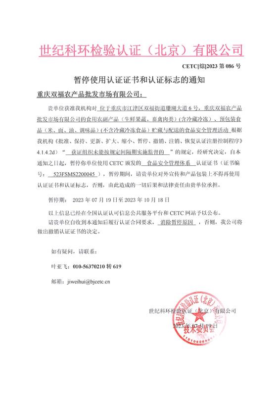 暫停使用認(rèn)證證書和認(rèn)證標(biāo)志的通知