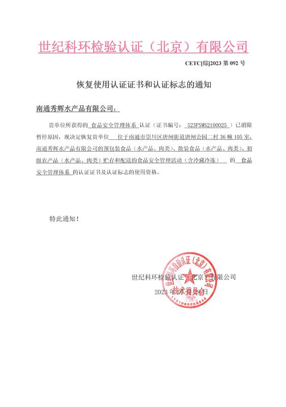 恢復(fù)使用認(rèn)證證書(shū)和認(rèn)證標(biāo)志的通知
