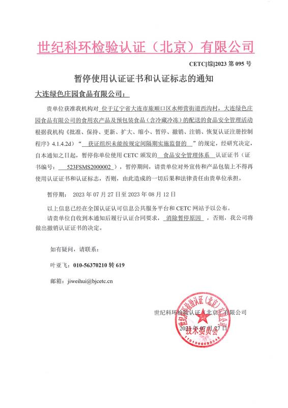 暫停使用認(rèn)證證書和認(rèn)證標(biāo)志的通知
