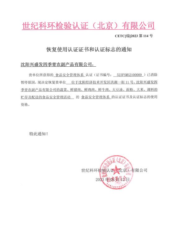 恢復(fù)使用認(rèn)證證書和認(rèn)證標(biāo)志的通知