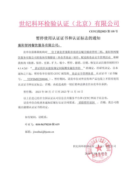 暫停使用認(rèn)證證書和認(rèn)證標(biāo)志的通知