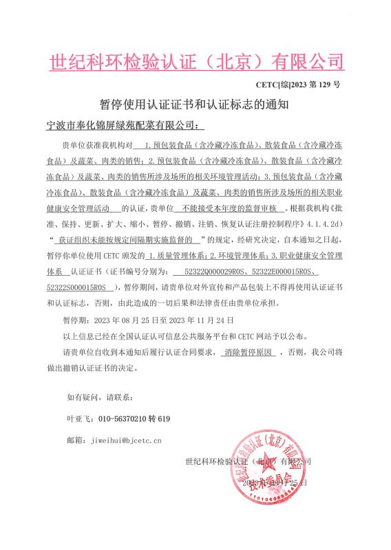 暫停使用認(rèn)證證書和認(rèn)證標(biāo)志的通知