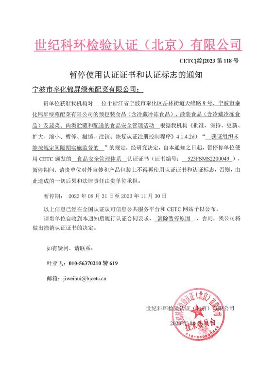 暫停使用認(rèn)證證書和認(rèn)證標(biāo)志的通知