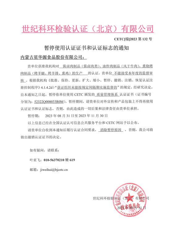 暫停使用認(rèn)證證書和認(rèn)證標(biāo)志的通知