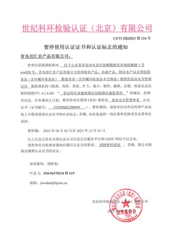 暫停使用認(rèn)證證書和認(rèn)證標(biāo)志的通知
