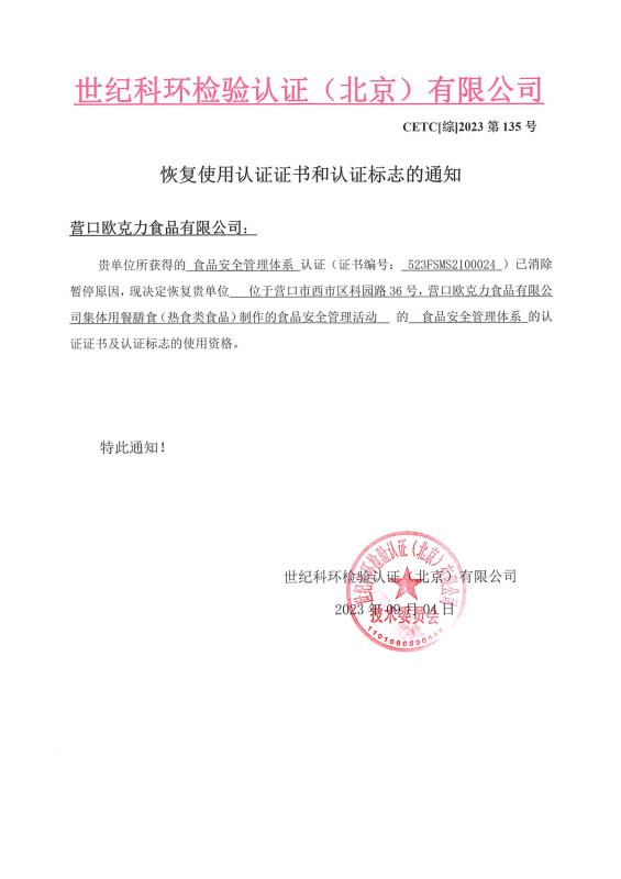 恢復(fù)使用認(rèn)證證書和認(rèn)證標(biāo)志的通知