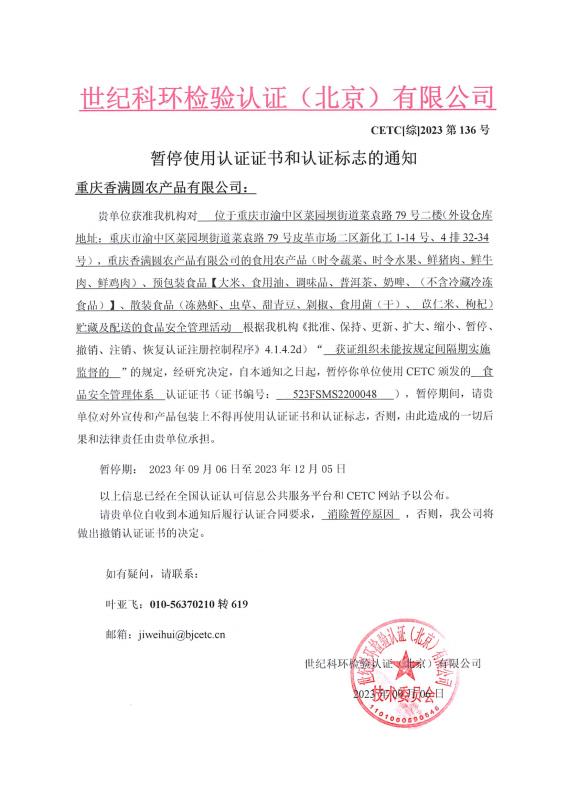 暫停使用認(rèn)證證書和認(rèn)證標(biāo)志的通知