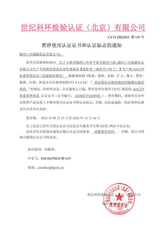 暫停使用認(rèn)證證書和認(rèn)證標(biāo)志的通知