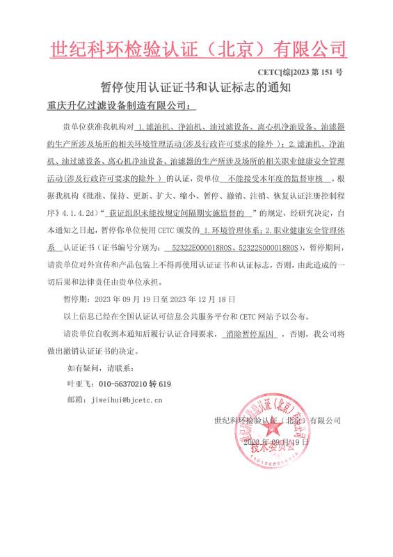 暫停使用認(rèn)證證書和認(rèn)證標(biāo)志的通知