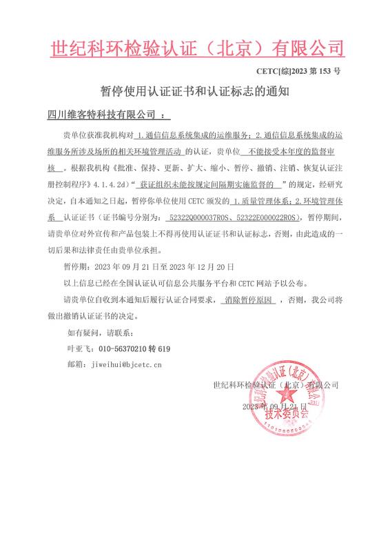 暫停使用認(rèn)證證書和認(rèn)證標(biāo)志的通知