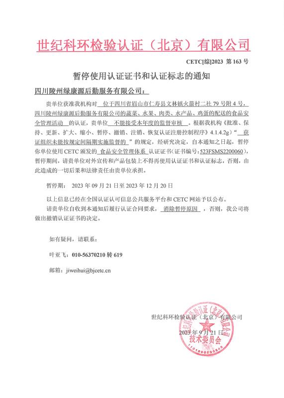 暫停使用認(rèn)證證書和認(rèn)證標(biāo)志的通知
