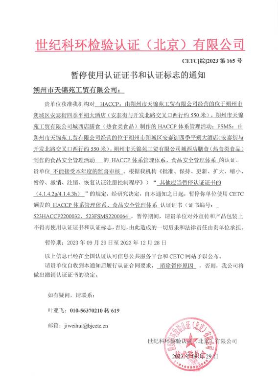 暫停使用認(rèn)證證書(shū)和認(rèn)證標(biāo)志的通知