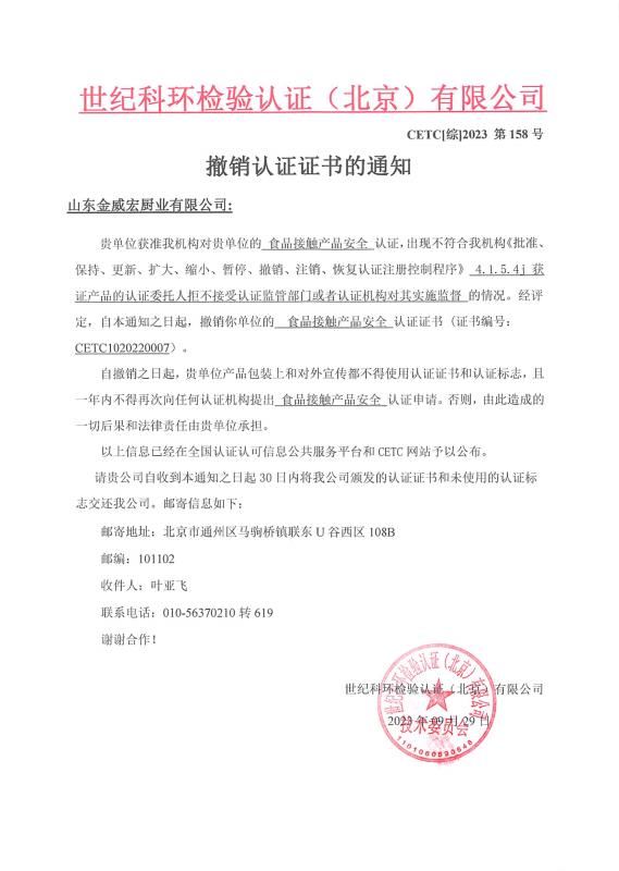 撤銷(xiāo)認(rèn)證證書(shū)的通知