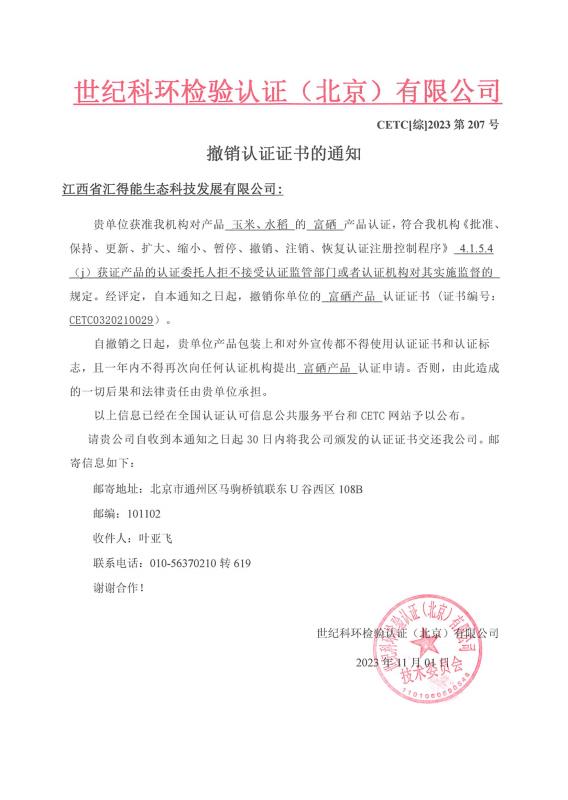 撤銷(xiāo)認(rèn)證證書(shū)的通知