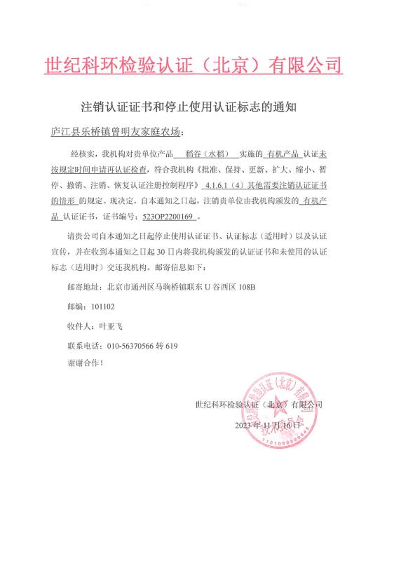 注銷(xiāo)認(rèn)證證書(shū)和停止使用認(rèn)證標(biāo)志的通知