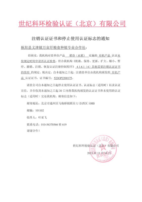 注銷認(rèn)證證書和停止使用認(rèn)證標(biāo)志的通知