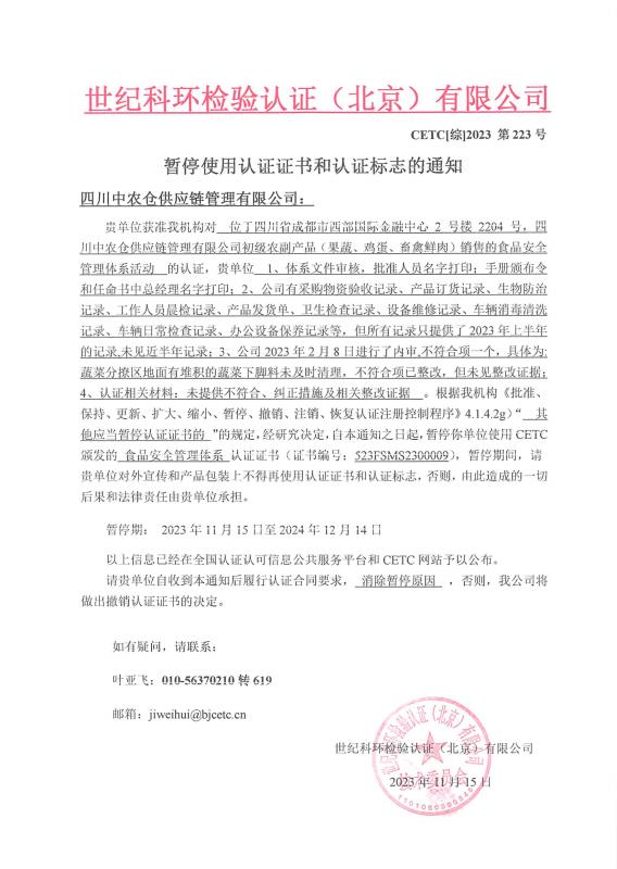 暫停使用認(rèn)證證書和認(rèn)證標(biāo)志的通知