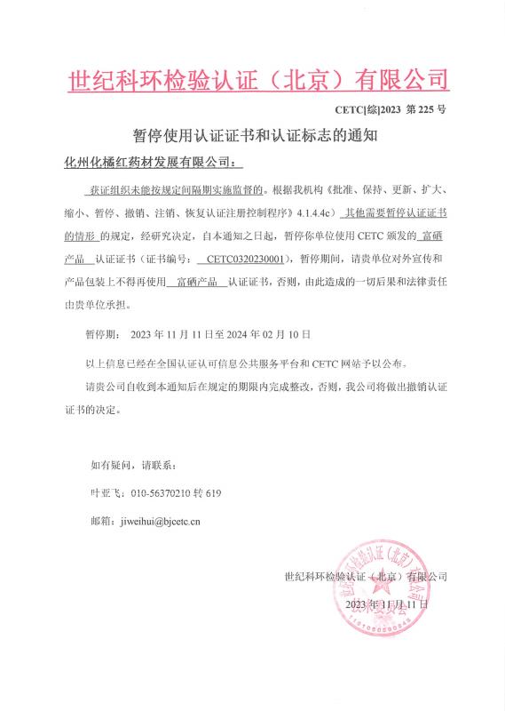暫停使用認(rèn)證證書和認(rèn)證標(biāo)志的通知