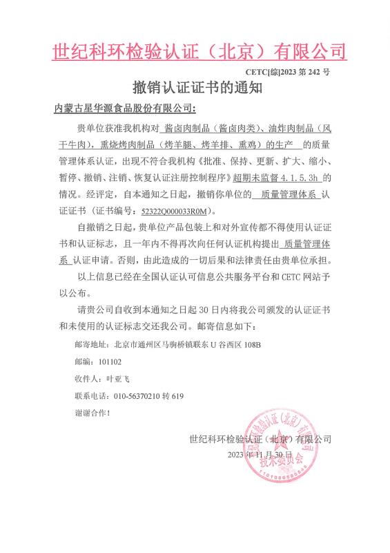 撤銷(xiāo)認(rèn)證證書(shū)的通知