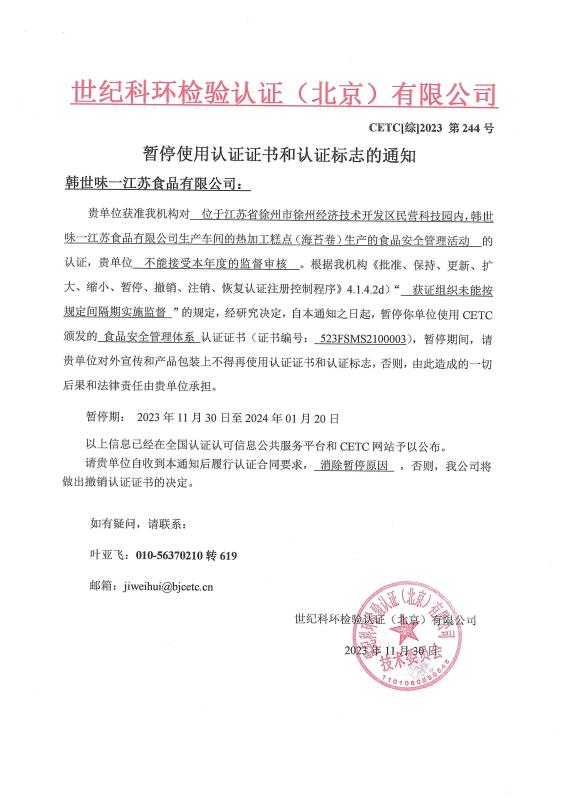 暫停使用認(rèn)證證書和認(rèn)證標(biāo)志的通知