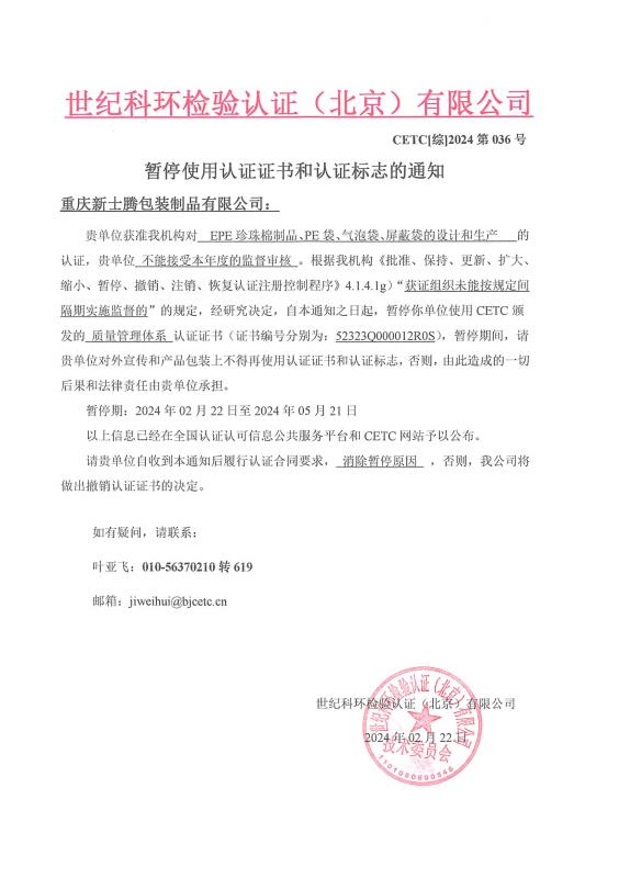 暫停使用認(rèn)證證書和認(rèn)證標(biāo)志的通知