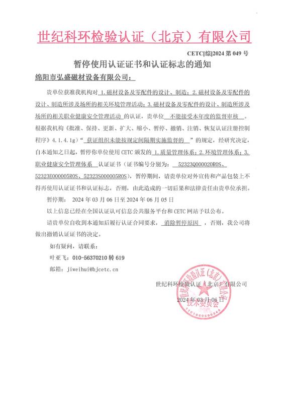 暫停使用認(rèn)證證書和認(rèn)證標(biāo)志的通知