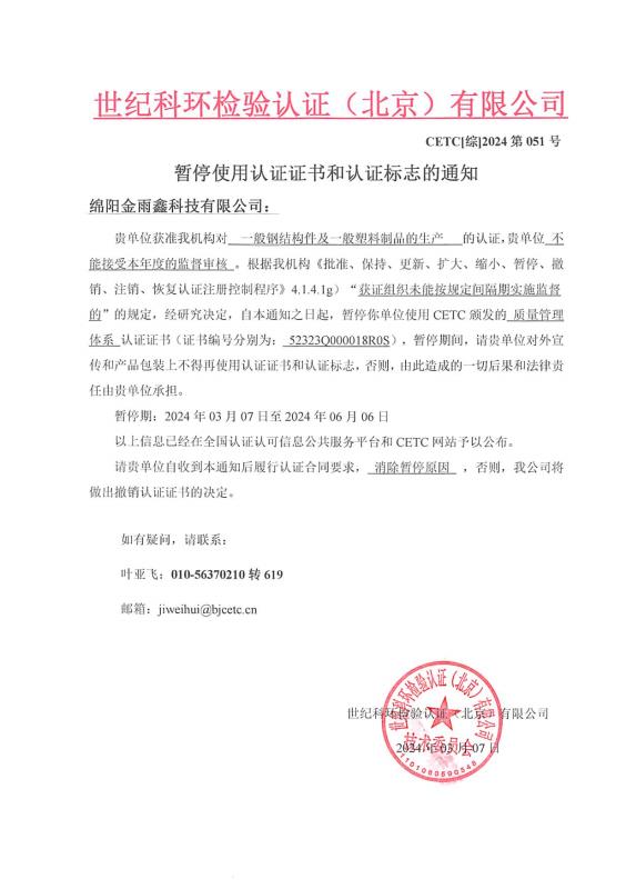 暫停使用認(rèn)證證書和認(rèn)證標(biāo)志的通知