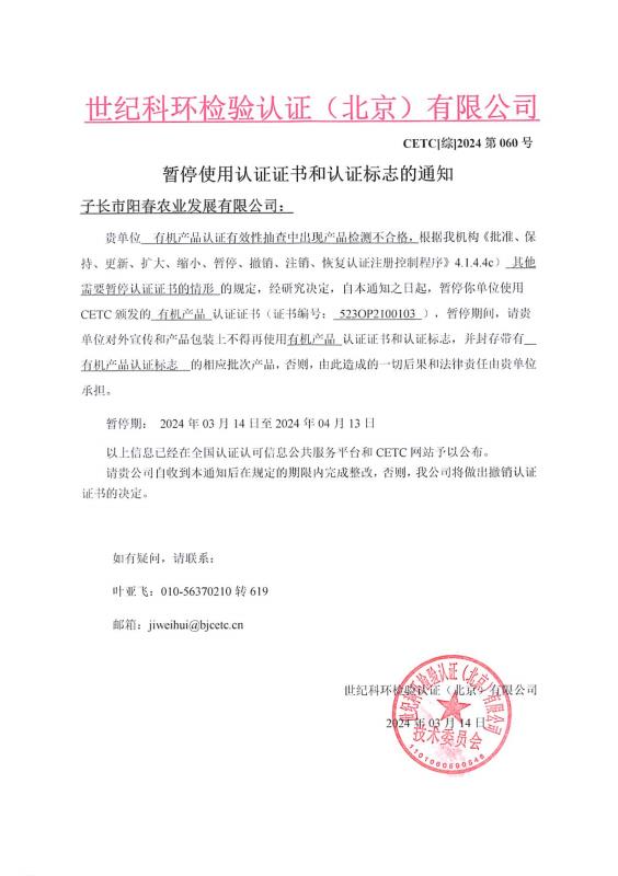 暫停使用認(rèn)證證書和認(rèn)證標(biāo)志的通知