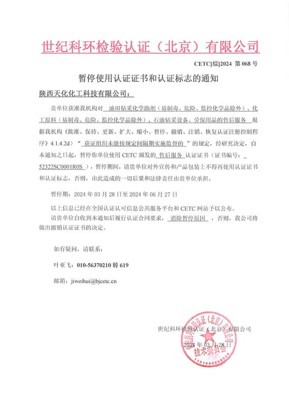 暫停使用認(rèn)證證書和認(rèn)證標(biāo)志的通知
