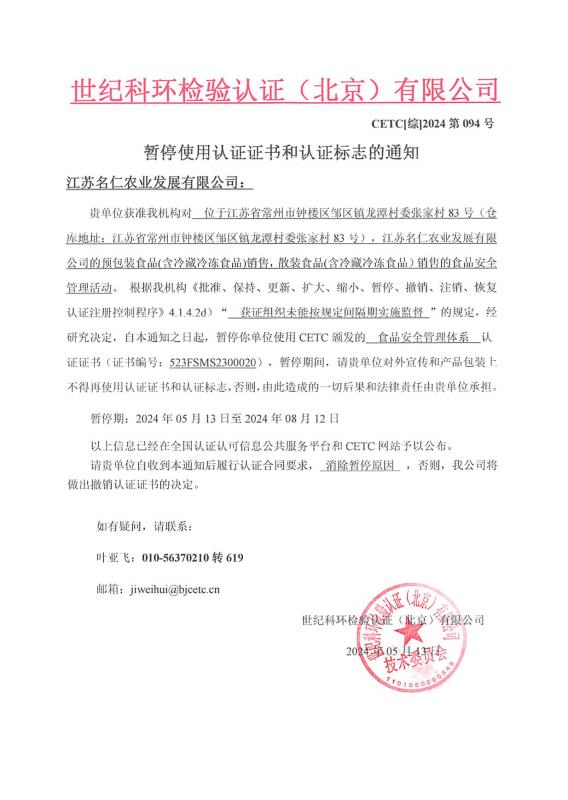 暫停使用認(rèn)證證書和認(rèn)證標(biāo)志的通知