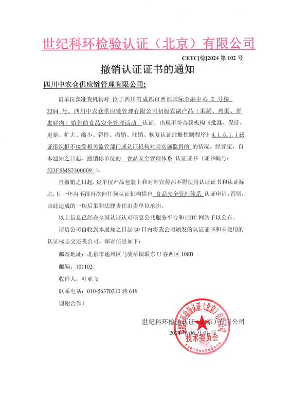 撤銷(xiāo)認(rèn)證證書(shū)的通知
