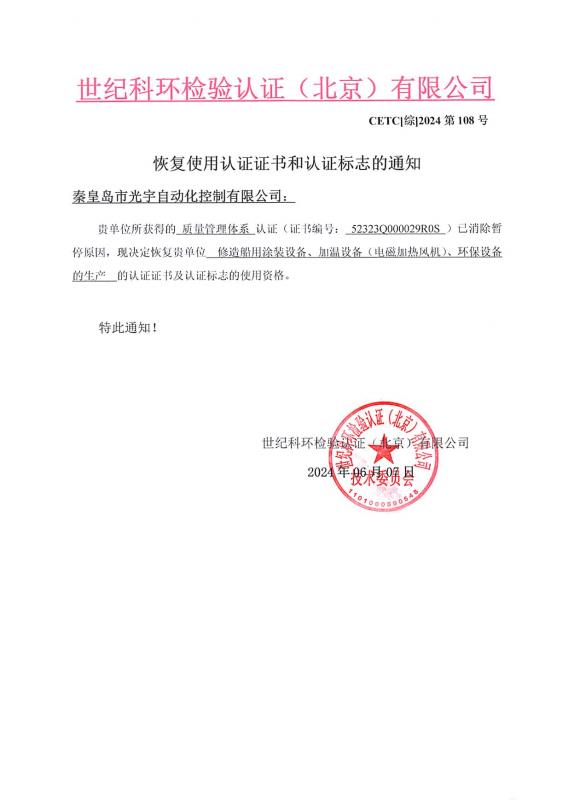 恢復(fù)使用認(rèn)證證書(shū)和認(rèn)證標(biāo)志的通知