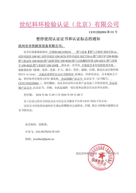 暫停使用認(rèn)證證書和認(rèn)證標(biāo)志的通知